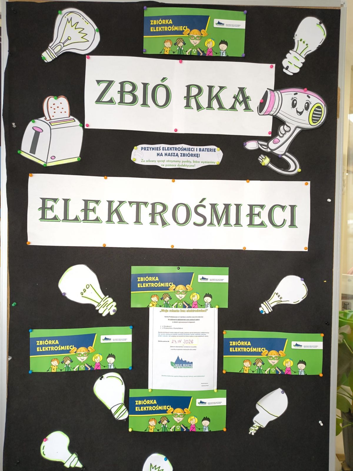 Kartony do których można oddawać zużyty, popsuty sprzęt elektryczny i elektroniczny (np. tostery, elektryczne czajniki, suszarki, klawiatury, myszki, monitory, telefony, grające zabawki, itd.) znajdują się na parterze blisko wejścia w obu budynkach szkoły.