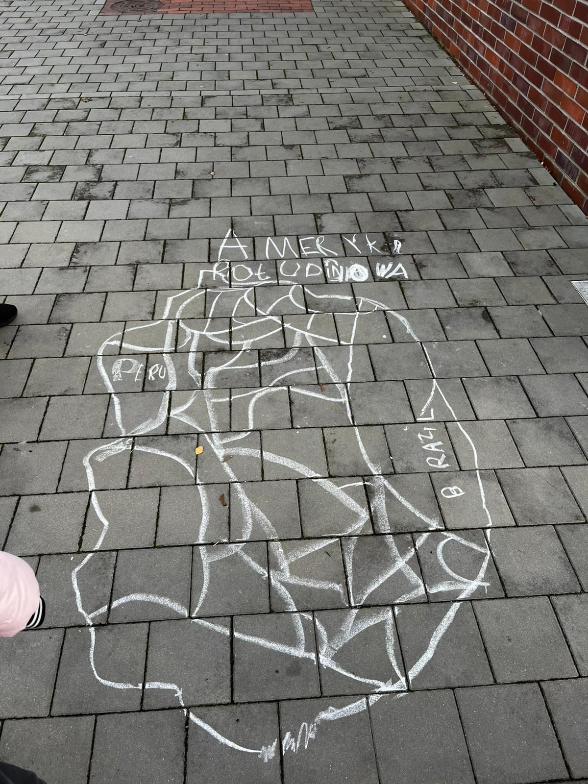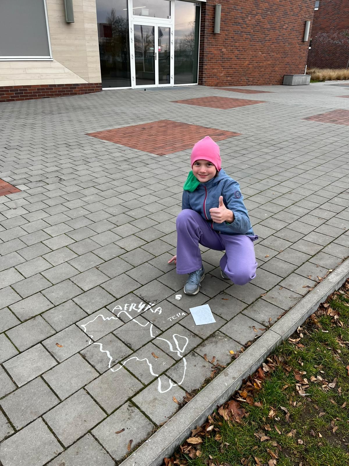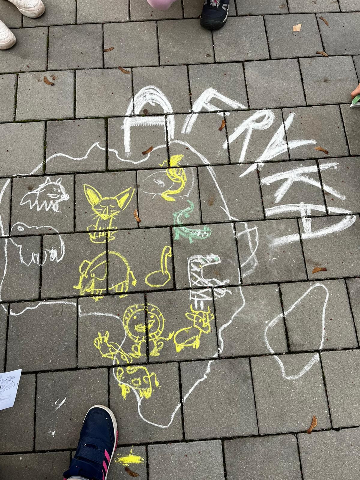 Następnie rozmawialiśmy o posiłkach, które spożywał Kazik. Dziwiliśmy się, że pigmejskie dzieci na deser jedzą sól, podczas gdy my mamy drugi żołądek na coś słodkiego. Chętni wzięli udział w zabawie „cukier czy sól” - zanurzali palce w jednym z pudełek, w których były te dwie rzeczy. Zaśpiewaliśmy piosenkę, dzięki której pamiętamy nazwy wszystkich kontynentów. Zagraliśmy w grę do afrykańskiej piosenki, która wyrabia poczucie rytmu i kooperację. Potem rysowaliśmy Afrykę kredą, omawiając zwierzęta tam żyjące i najbardziej charakterystyczne elementy krajobrazu jak Kilimandżaro, Sahara czy Nil.