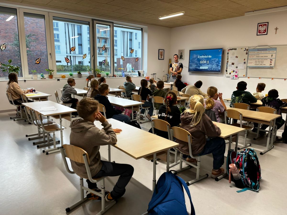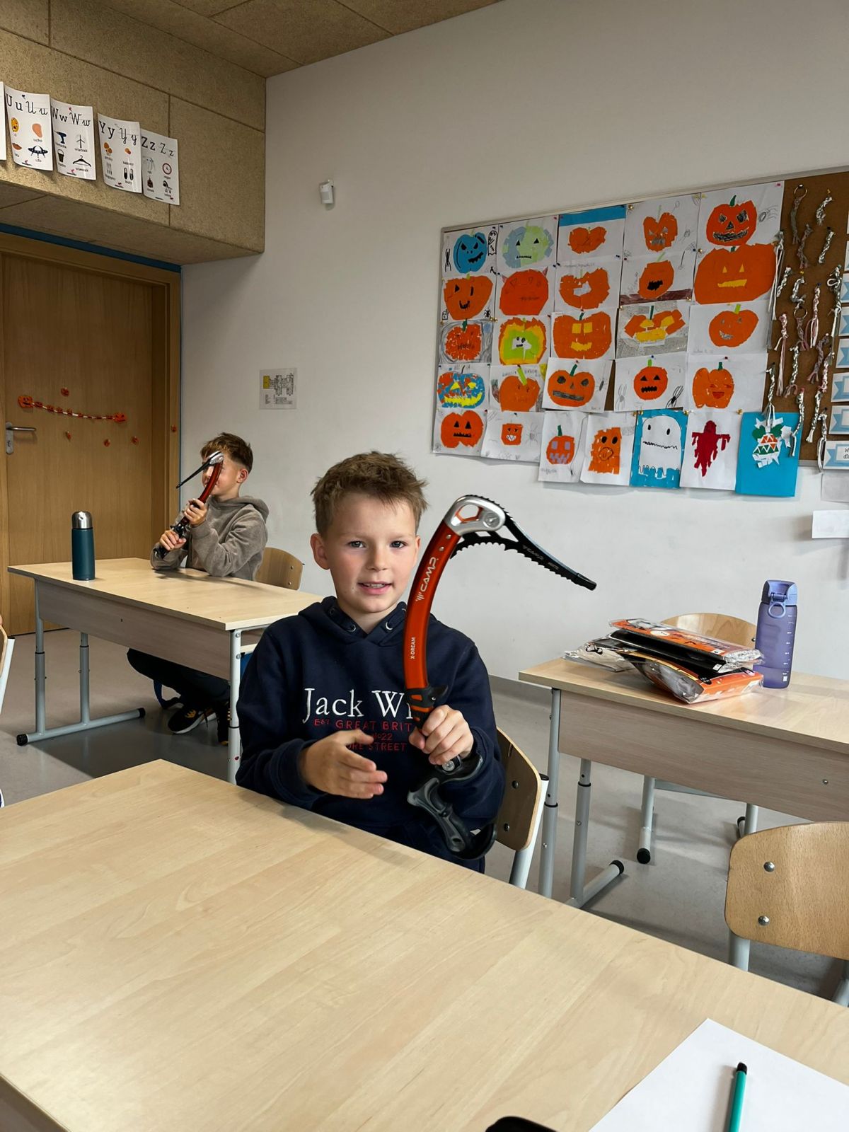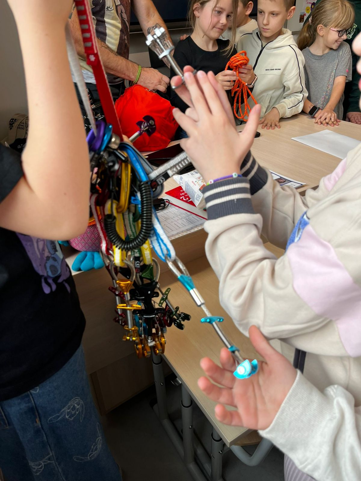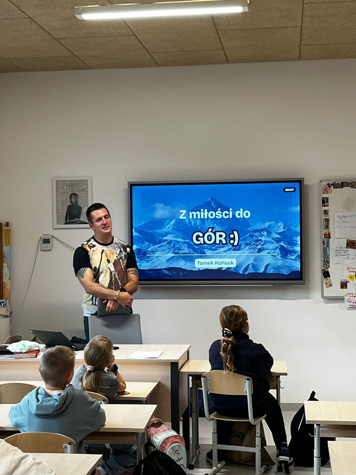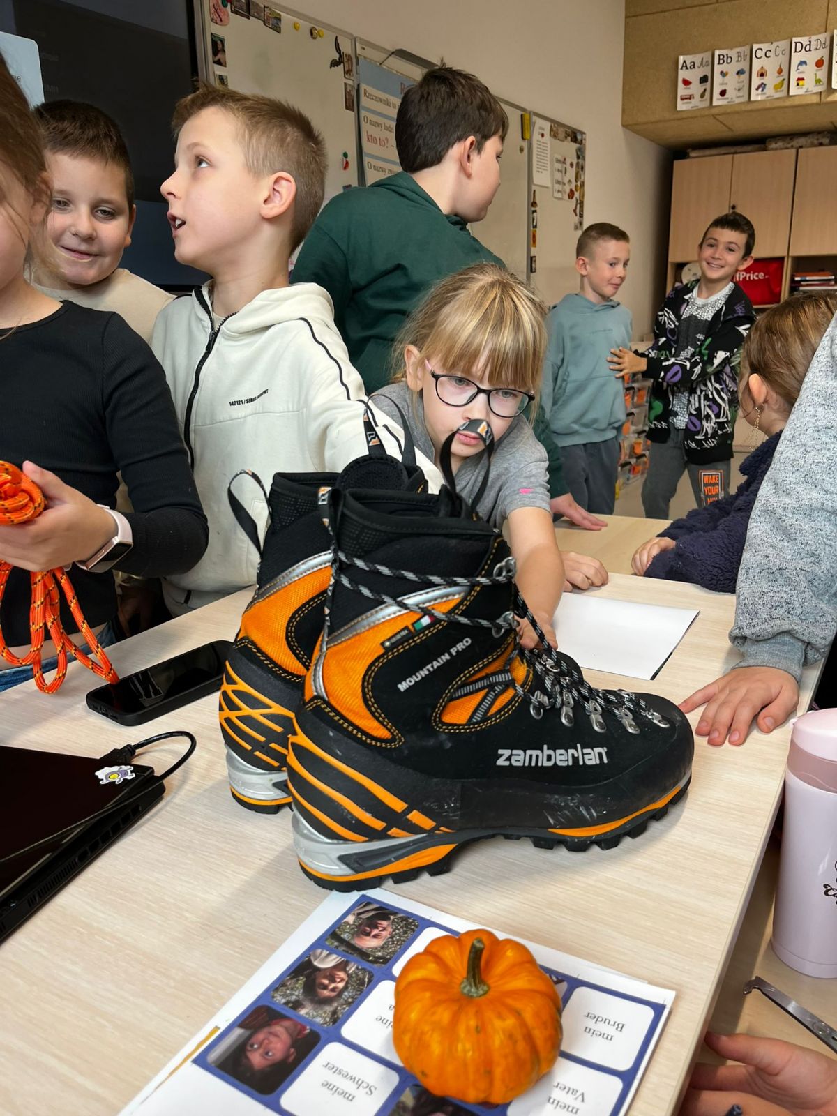 Dzisiaj klasę 3e odwiedził tata Martynki - pan Tomek Kohsek. Przyszedł do nas objuczony w sprzęt górski niczym Szerpa. Pan Tomek opowiadał o swojej wielkiej pasji, jaką jest chodzenie po górach. Uczniowie dowiedzieli się, które szczyty górskie są najwyższe, jakie są podstawowe zasady zachowania bezpieczeństwa w górach zarówno podczas weekendowych trekkingów z rodziną, jak i podczas już bardziej wyczynowego zdobywania szczytów. Obejrzeliśmy zdjęcia i filmy z zapierającymi dech widokami, jak i z zasłaniającymi wszystko chmurami czy mgłą - pogoda lubi płatać figle alpinistom. Potem wszyscy zgromadzili się wokół plecaka pana Tomka niczym wokół worka świętego Mikołaja, a Pan Tomek zaczął wyciągać z niego buty górskie, uprzęże, liny, czekany, raki i inne sprzęty niezbędne podczas górskich wspinaczek, co wzbudziło w dzieciach niemały entuzjazm.
