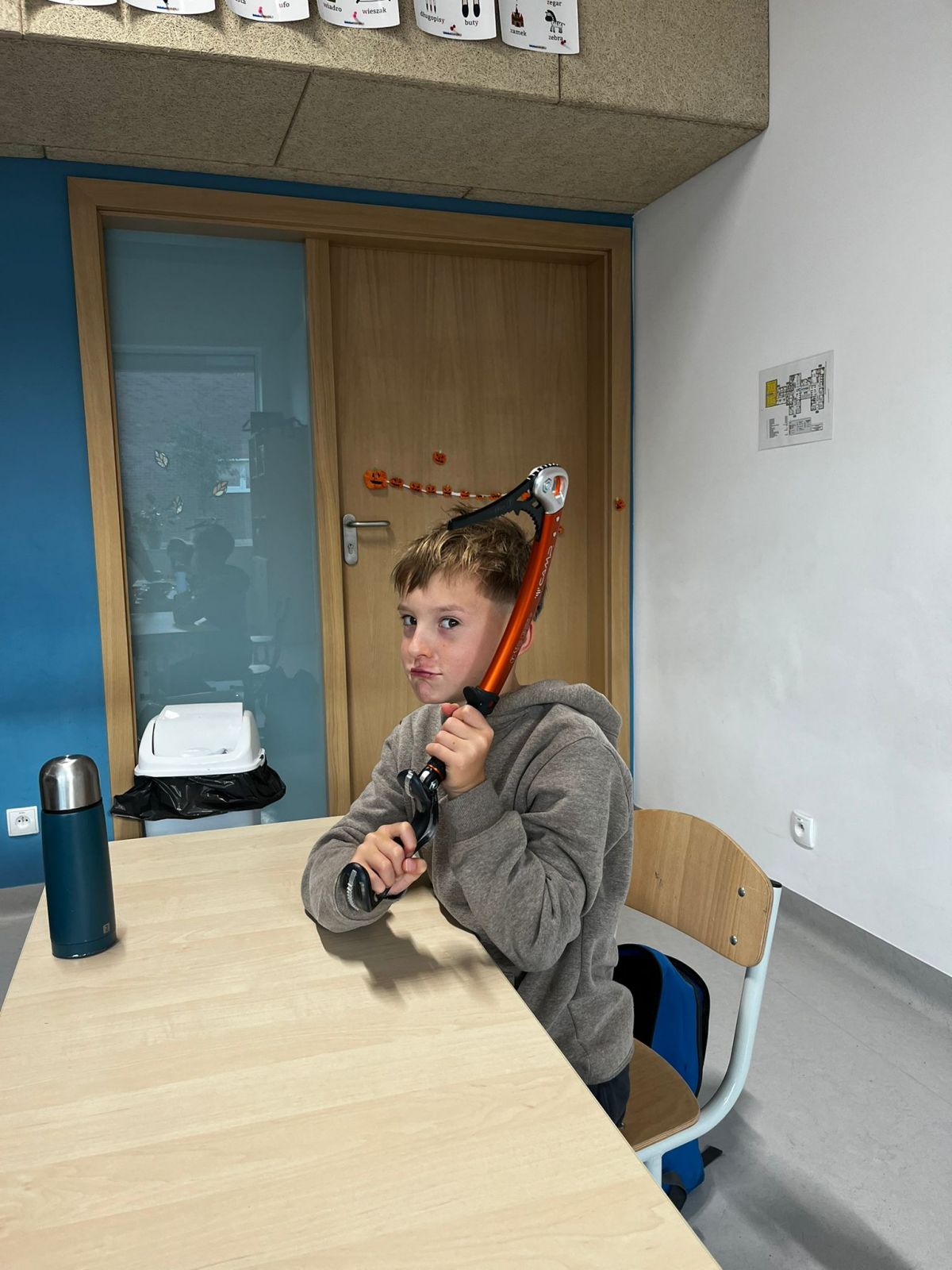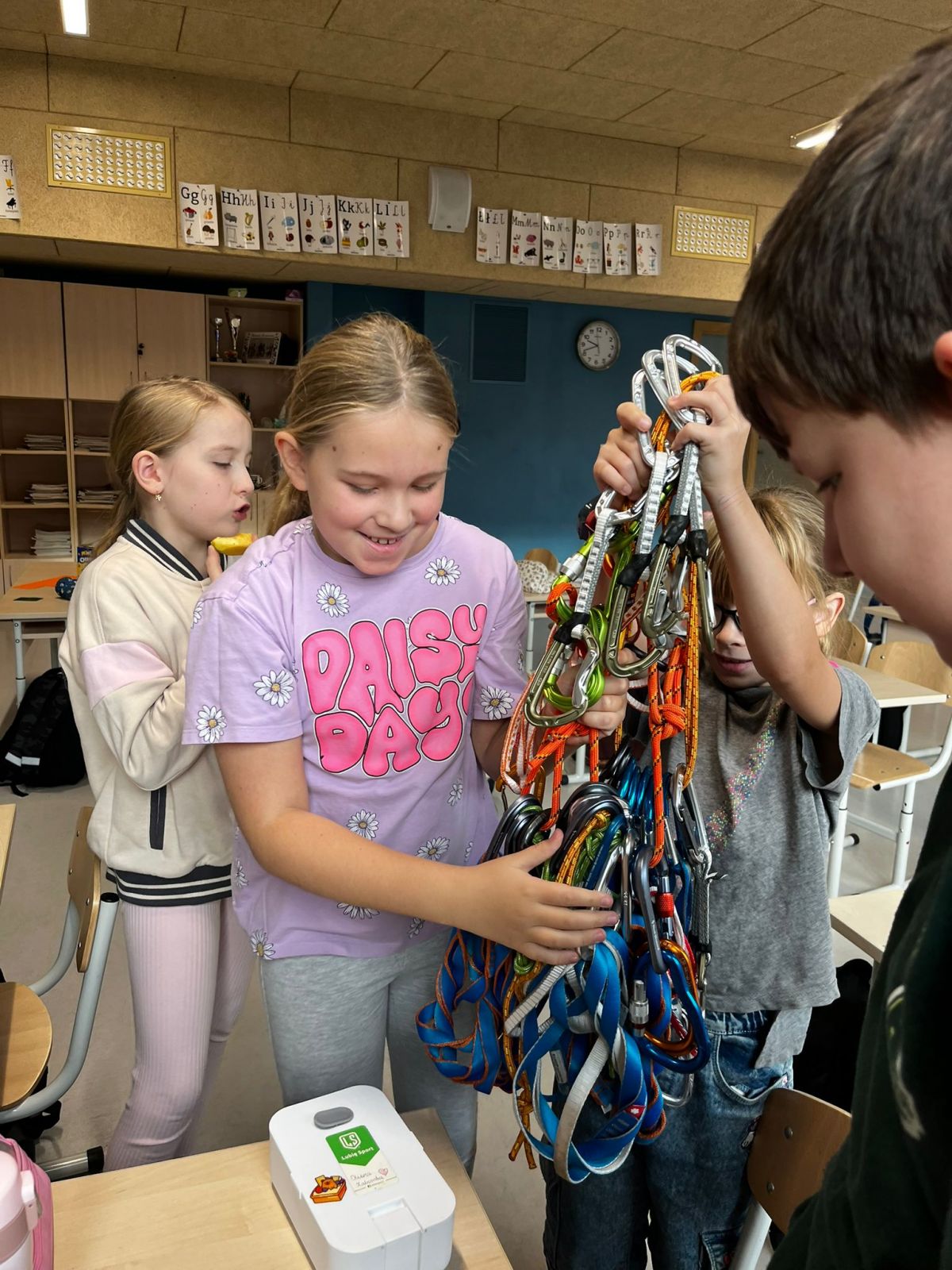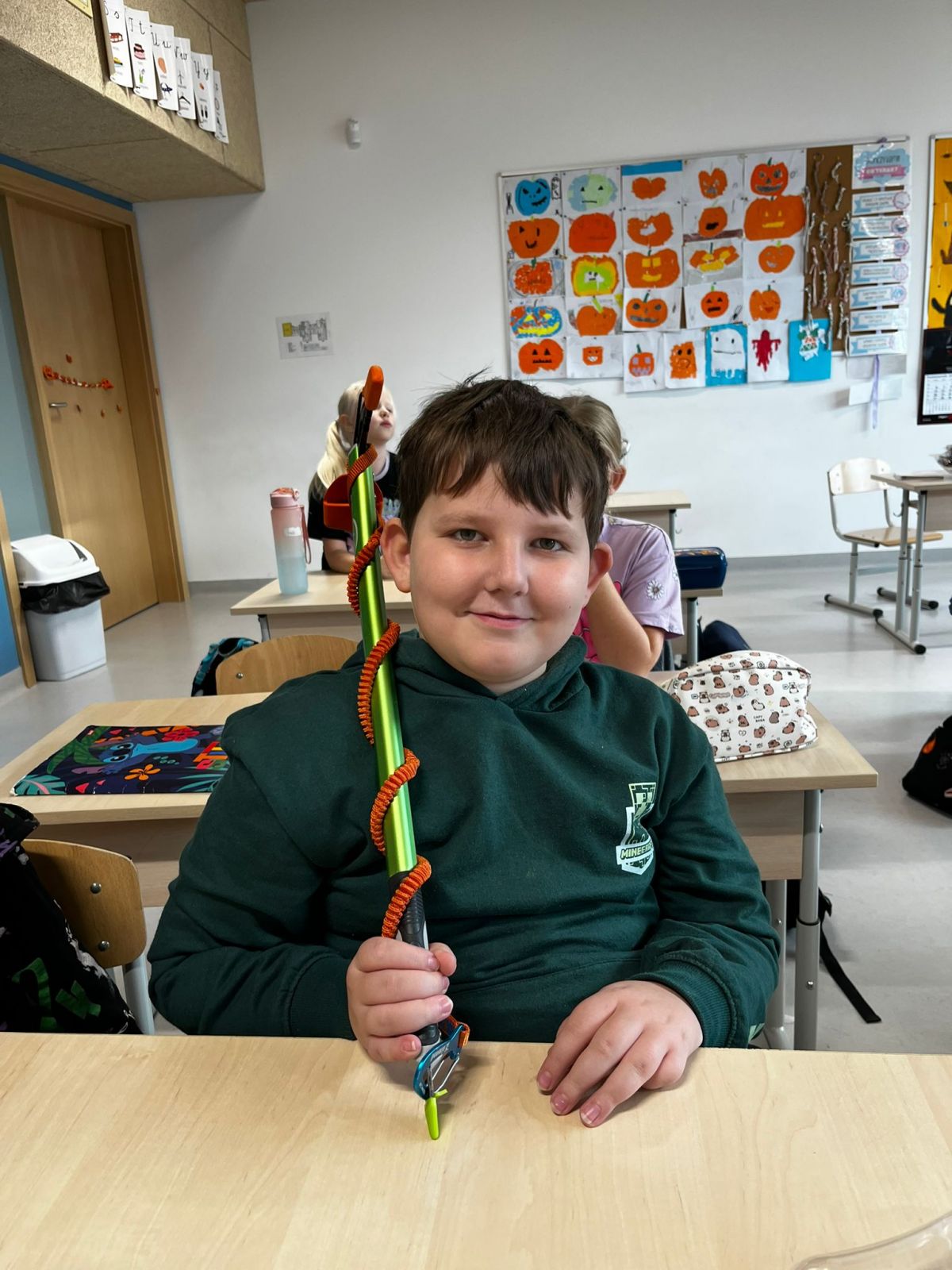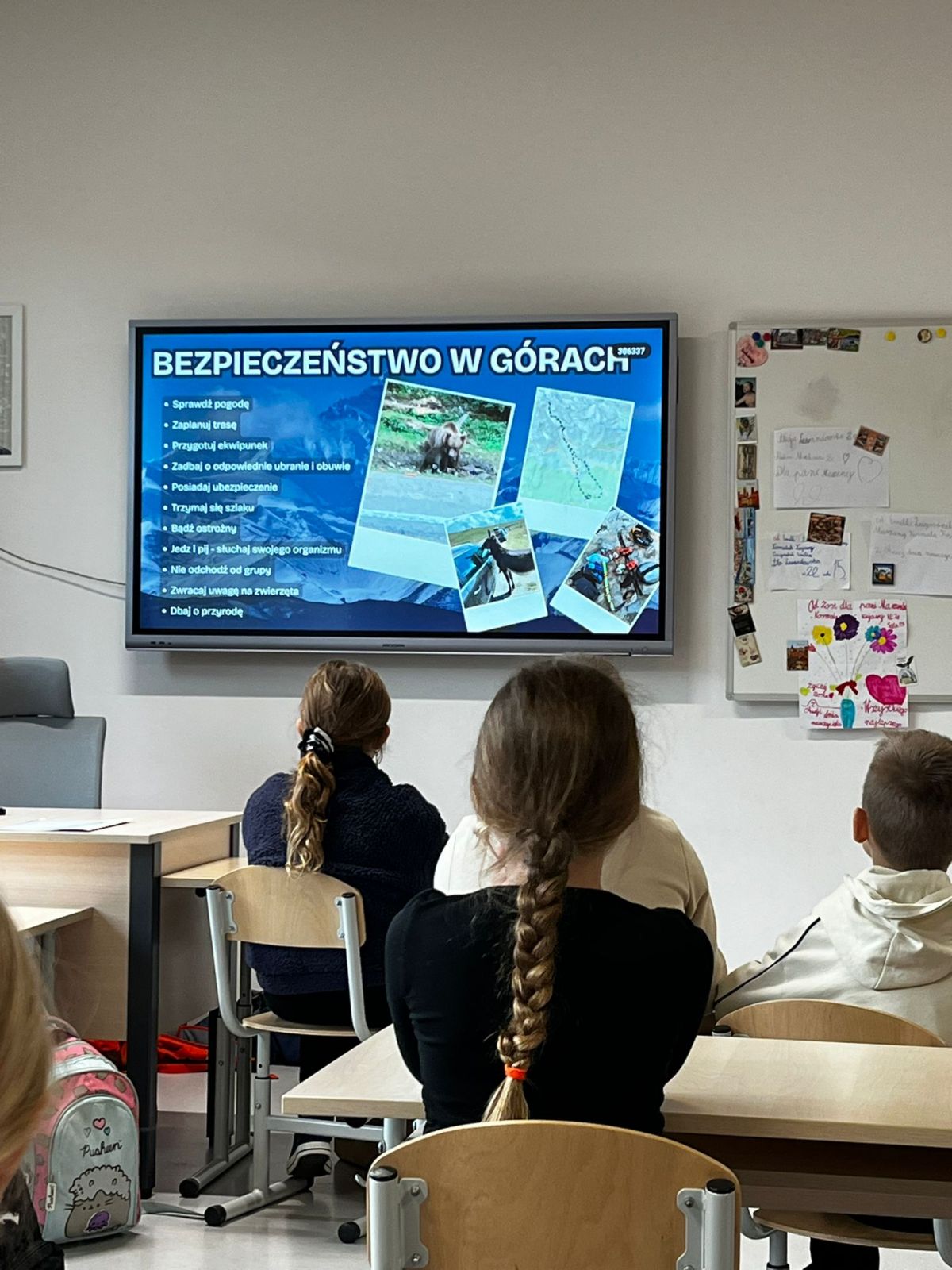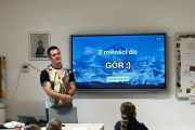 Dzisiaj klasę 3e odwiedził tata Martynki - pan Tomek Kohsek. Przyszedł do nas objuczony w sprzęt górski niczym Szerpa. Pan Tomek opowiadał o swojej wielkiej pasji, jaką jest chodzenie po górach. Uczniowie dowiedzieli się, które szczyty górskie są najwyższe, jakie są podstawowe zasady zachowania bezpieczeństwa w górach zarówno podczas weekendowych trekkingów z rodziną, jak i podczas już bardziej wyczynowego zdobywania szczytów. Obejrzeliśmy zdjęcia i filmy z zapierającymi dech widokami, jak i z zasłaniającymi wszystko chmurami czy mgłą - pogoda lubi płatać figle alpinistom. Potem wszyscy zgromadzili się wokół plecaka pana Tomka niczym wokół worka świętego Mikołaja, a Pan Tomek zaczął wyciągać z niego buty górskie, uprzęże, liny, czekany, raki i inne sprzęty niezbędne podczas górskich wspinaczek, co wzbudziło w dzieciach niemały entuzjazm.