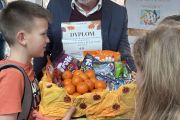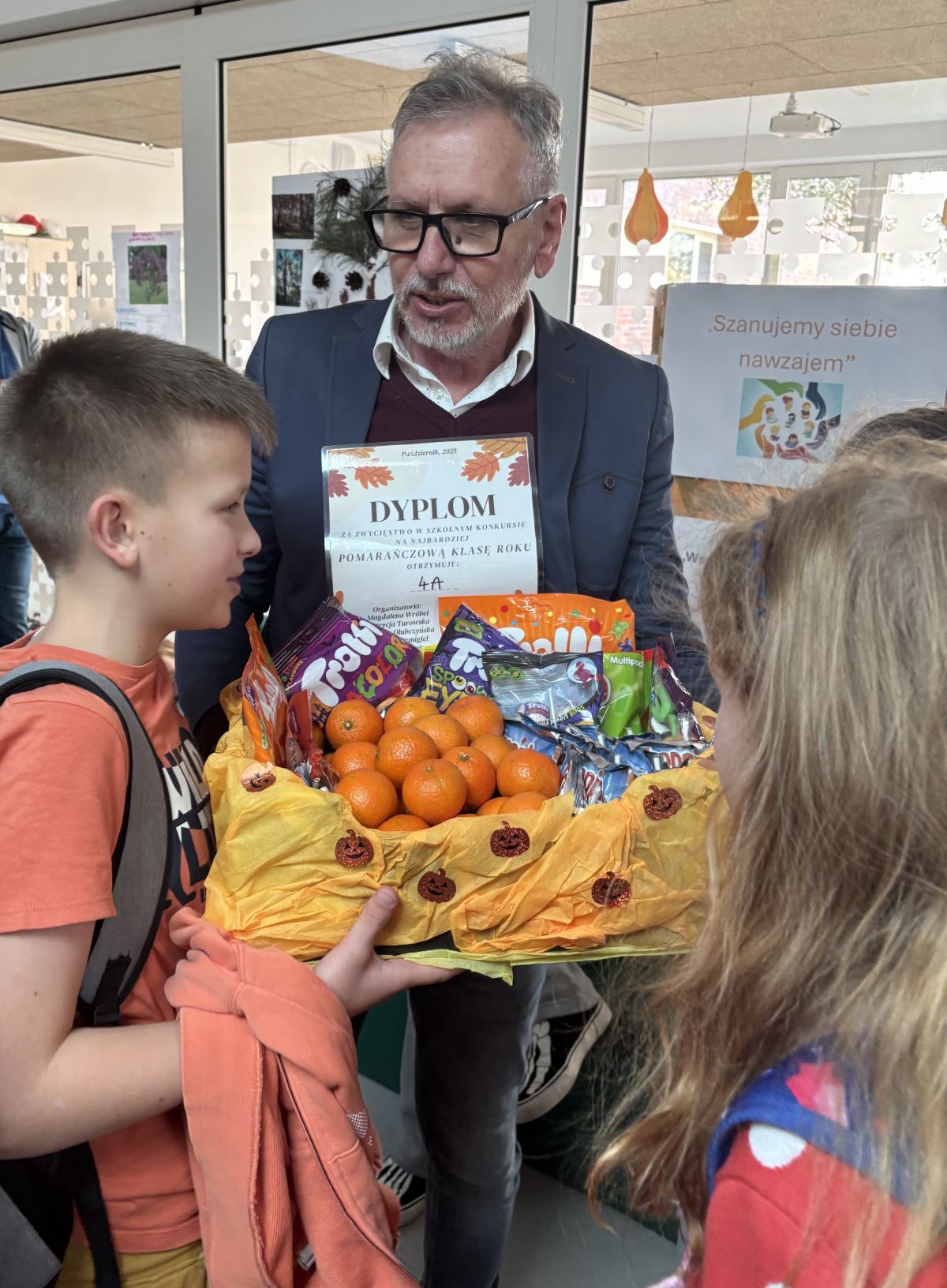 Zwycięska klasa otrzymała nagrodę, sfinansowaną ze środków Rady Rodziców. Dziękujemy! Skrzynka pełna pomarańczowych słodkości i mandarynek oraz pamiątkowy dyplom zostały wręczone uczniom przez Dyrektora.