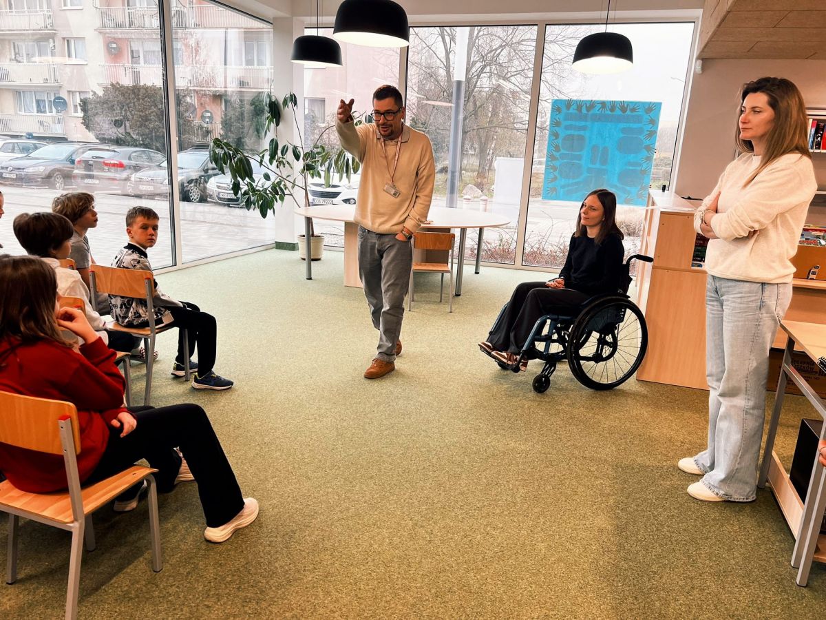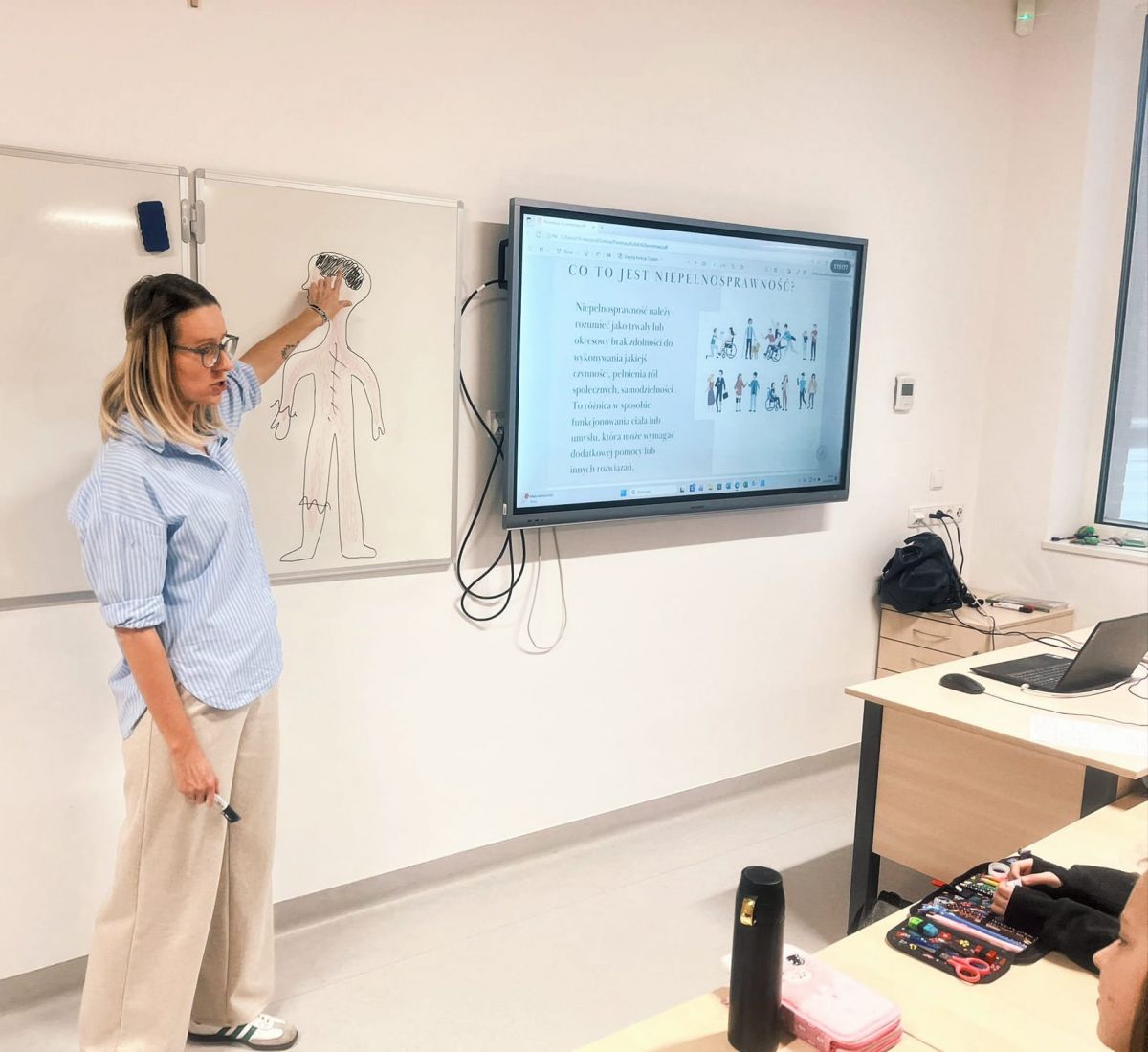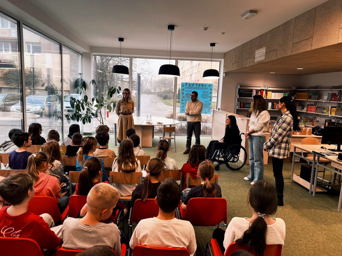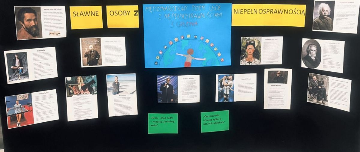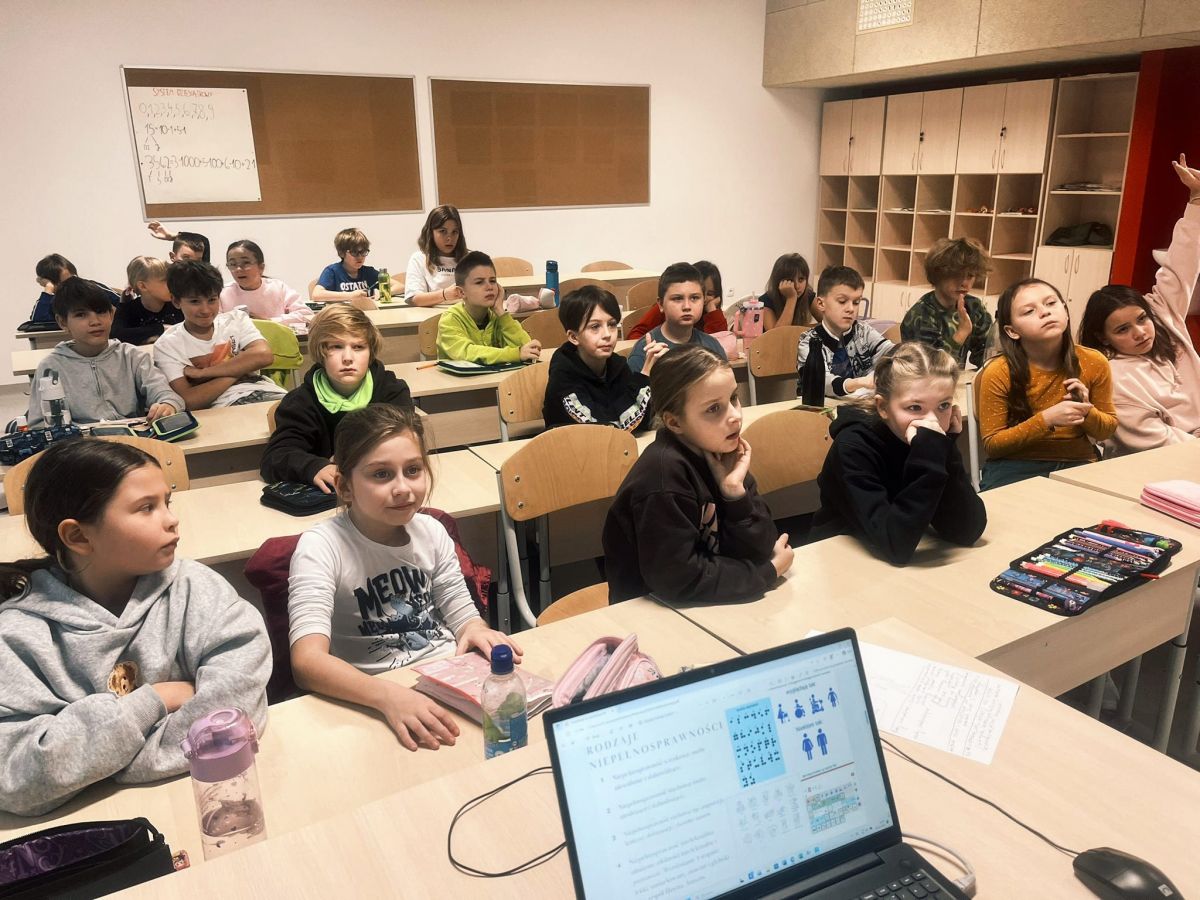 Z okazji Międzynarodowego Dnia Osób z Niepełnosprawnościami (3.12.2025 r.), uczniowie klasy 4a i 4c wzięli udział w zajęciach poświęconych tematyce niepełnosprawności. W trakcie zajęć dzieci dowiedziały się m.in. jakie są rodzaje i przyczyny i niepełnosprawności, poznały zasady savoire-vivre wobec osób z niepełnosprawnościami. Ważnym elementem było omówienie właściwych form udzielania pomocy, szacunku czy unikanie stereotypów. Uczniowie mieli także możliwość wzięcia udziału w krótkich symulacjach ograniczeń związanych ze słuchem i wzrokiem, które były cennym doświadczeniem. W czasie przerw wszyscy uczniowie mogli dzięki wystawie poznać sławne osoby z niepełnosprawnościami. Podsumowaniem tego wyjątkowego dnia było spotkanie z zaproszonymi gośćmi: Panią Martyną i Panem Maciejem, którzy odpowiedzieli o wyzwaniach jakie napotykają osoby poruszające się na wózku inwalidzkim i rozwiązaniach ułatwiających dostępność. Pani Martyna podzieliła się z nami swoim doświadczeniem codziennego funkcjonowania. Wizytę wzbogaciła otwarta rozmowa podczas której dzieci mogły zadawać swobodne pytania. Spotkanie było dla nas wszystkich niezwykle wartościowe - mieliśmy okazję nie tylko zdobyć wiedzę, ale również zrozumieć, jak ważne jest tworzenie świata i przestrzeni przyjaznej wszystkim ludziom. Rozmowa skłoniła uczniów do refleksji, uczyła wrażliwości i szacunku dla różnorodności.