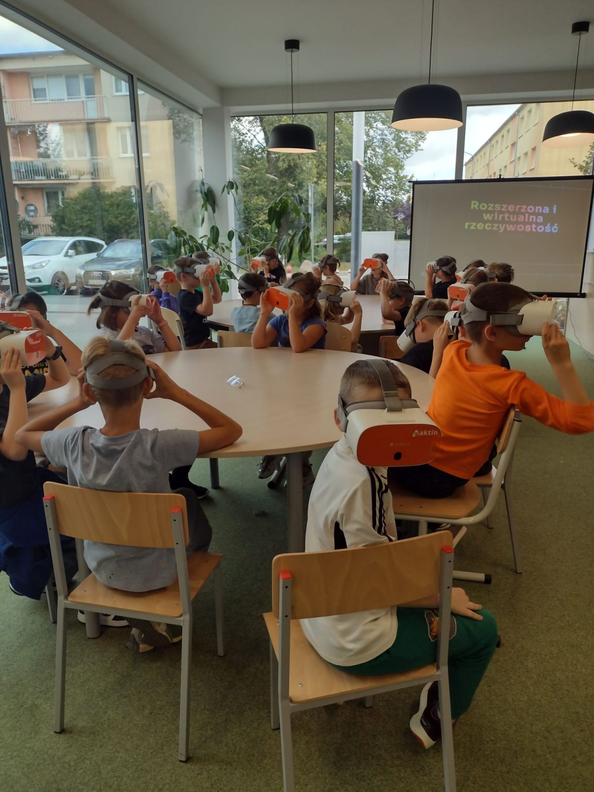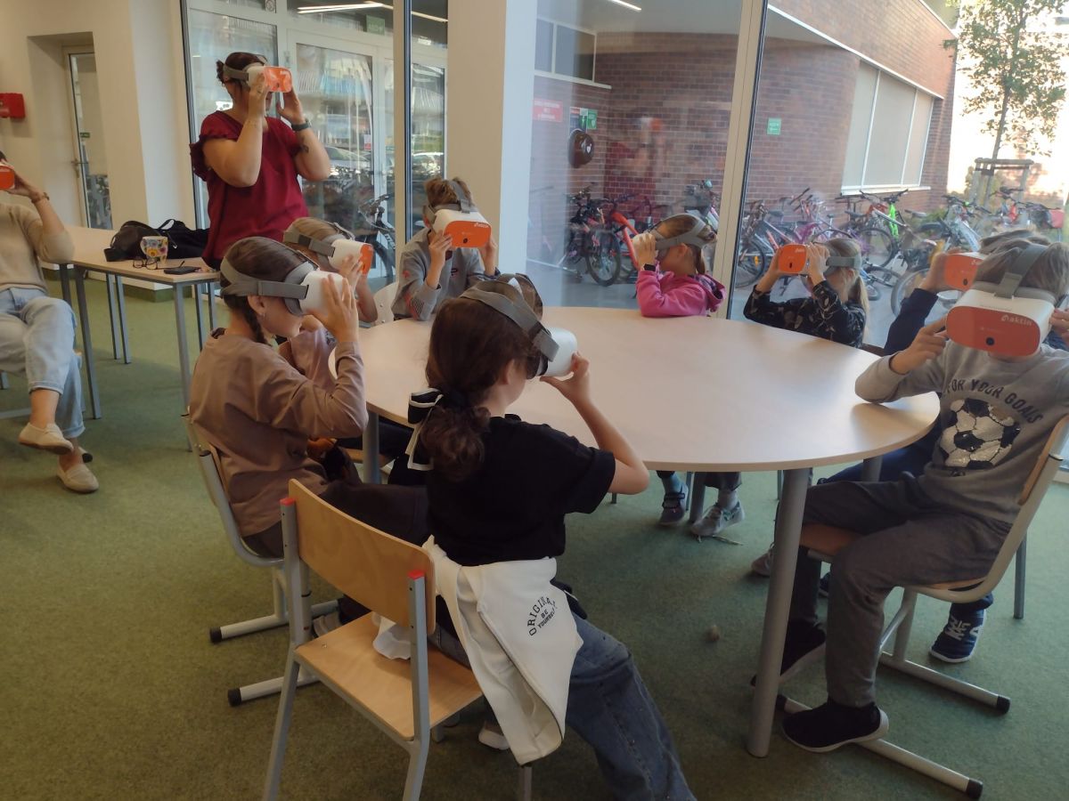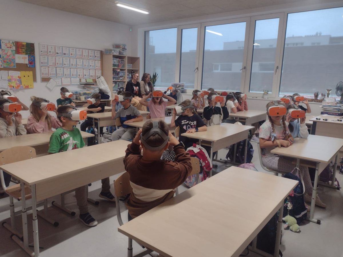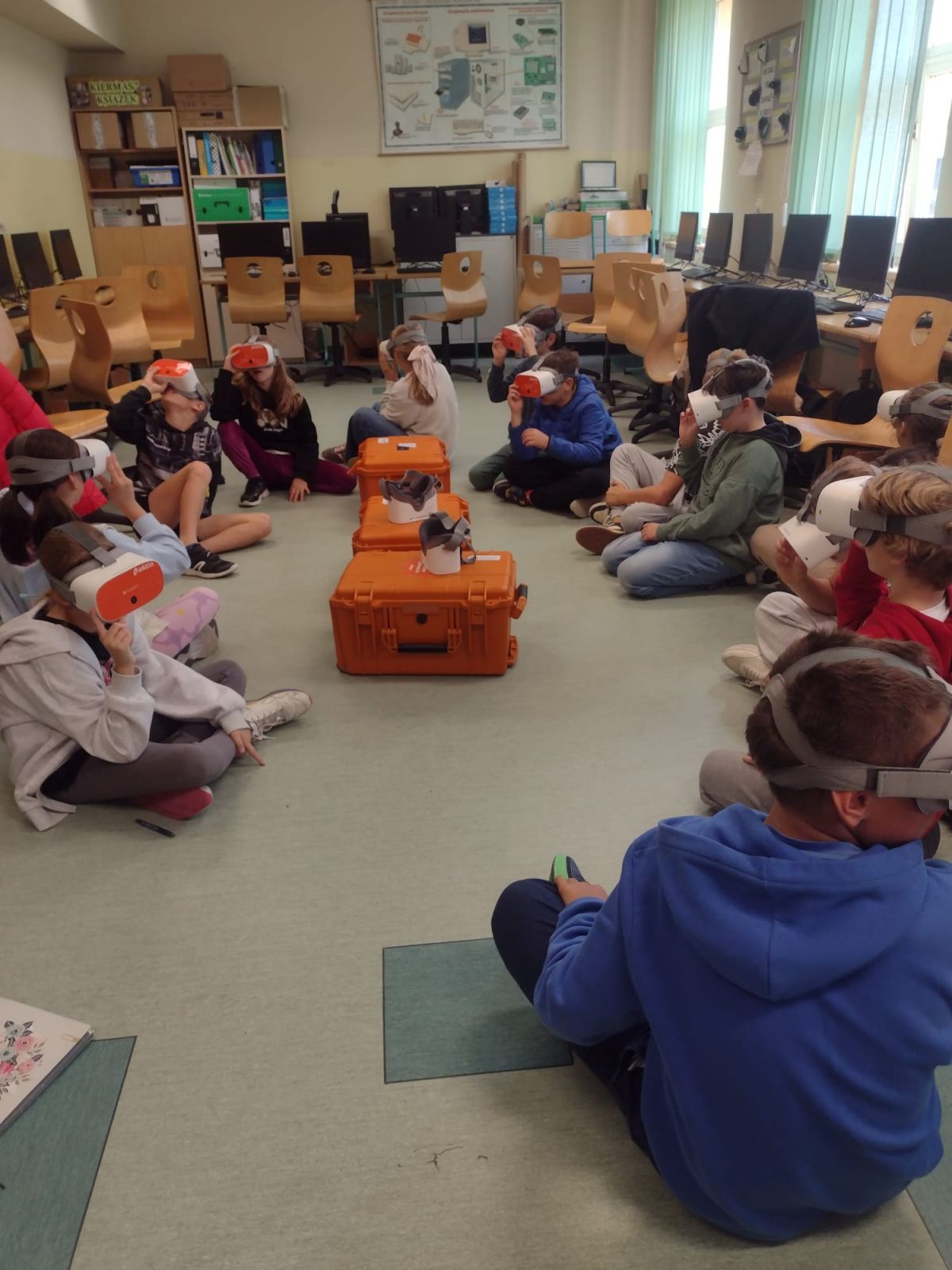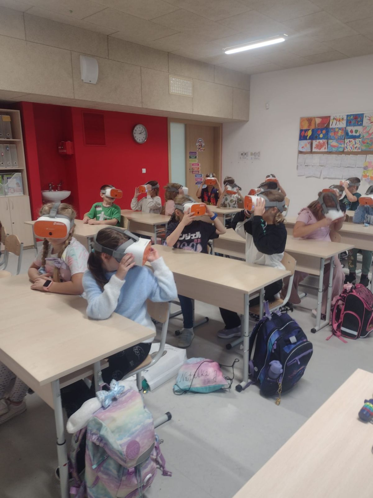 Uczniowie klas 3f, 3g, 3c, 2c oraz uczestnicy kół robotycznych z klas 4–5 i 6–7 wzięli udział w wyjątkowych zajęciach z wykorzystaniem okularów VR. Dzięki tej nowoczesnej technologii mogli przenieść się w zupełnie inny wymiar nauki – dosłownie!