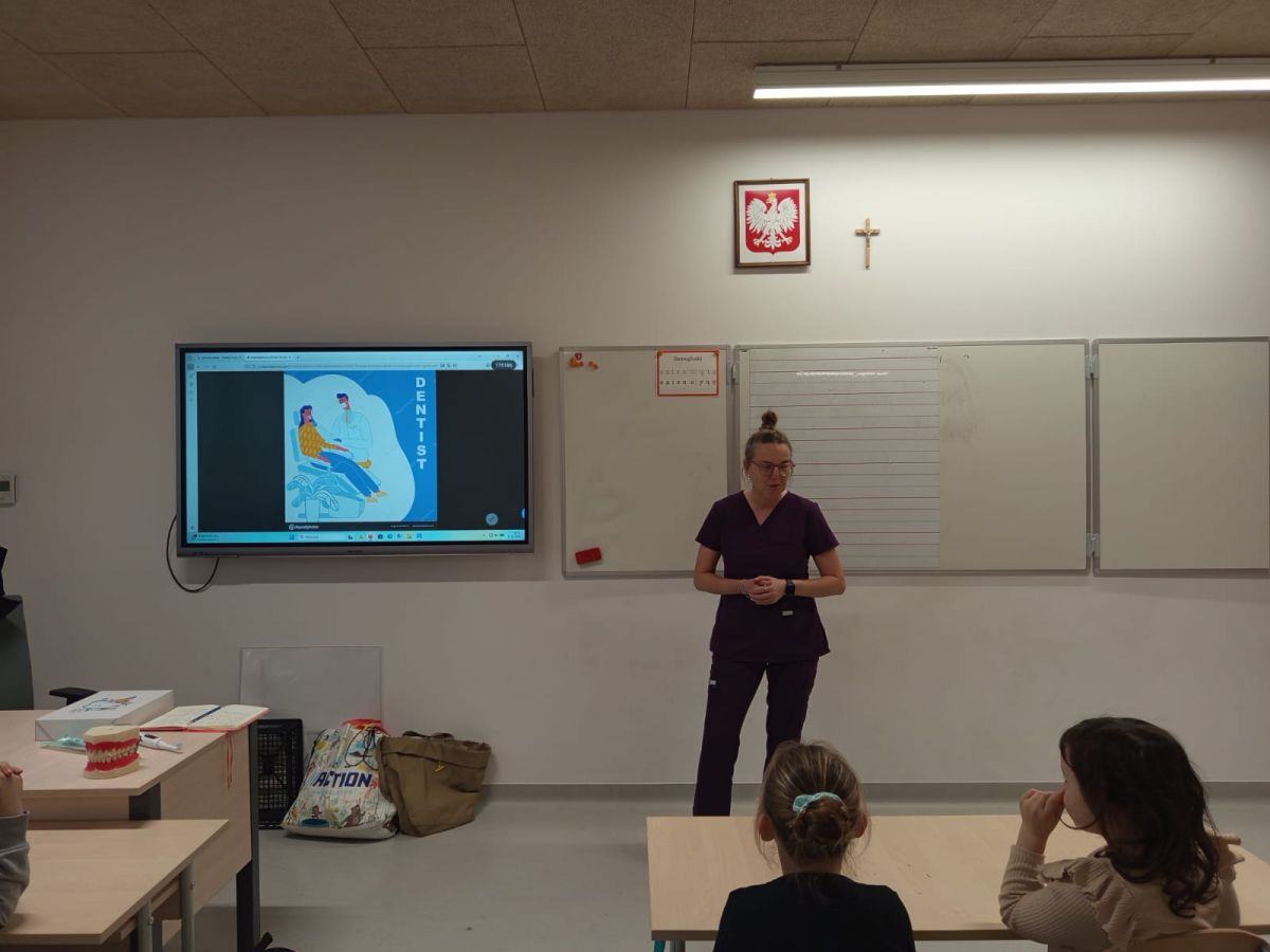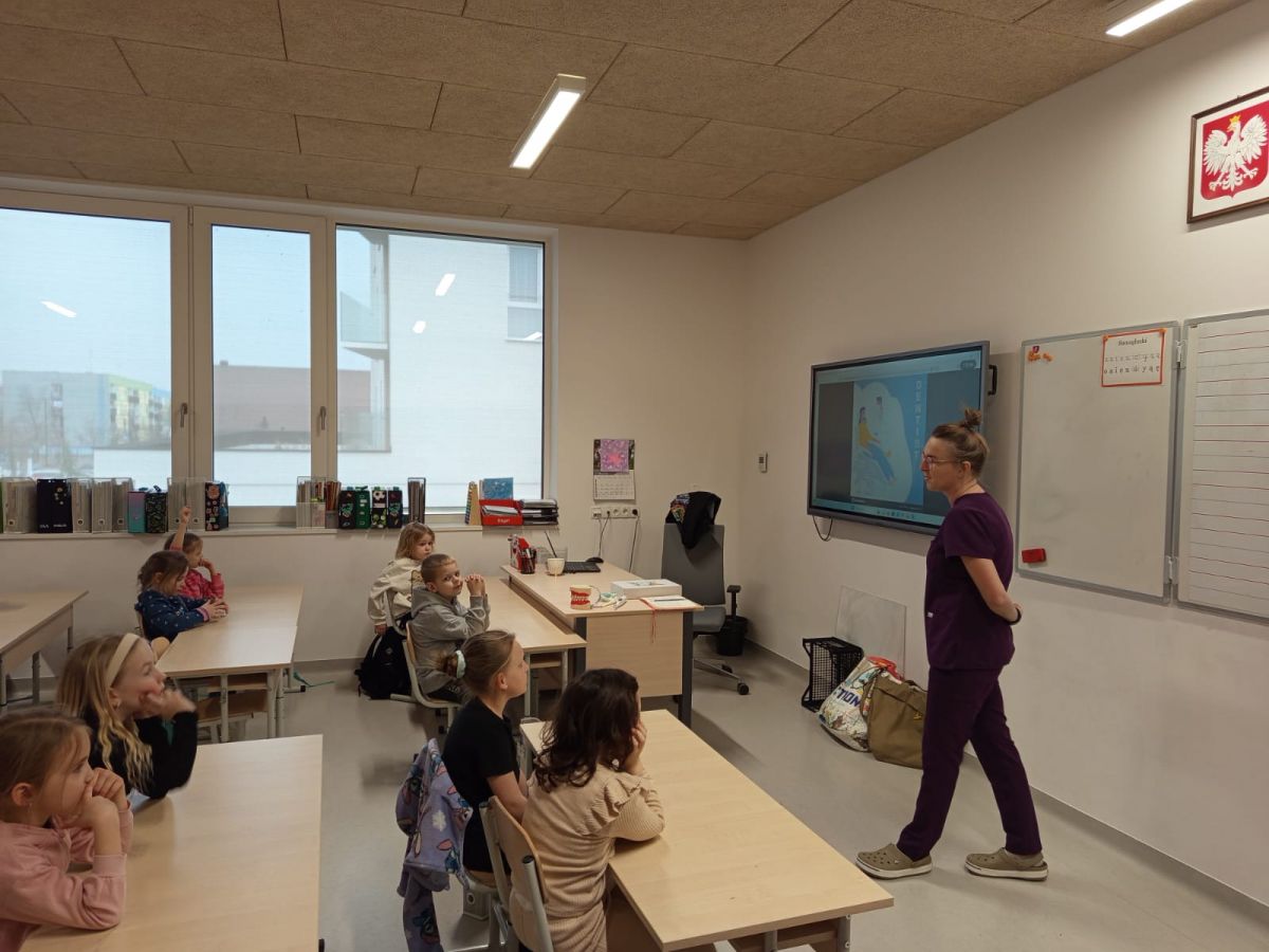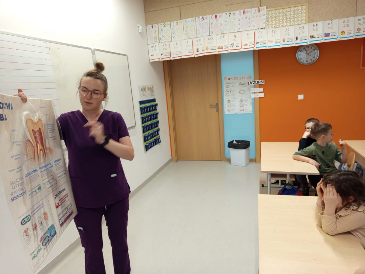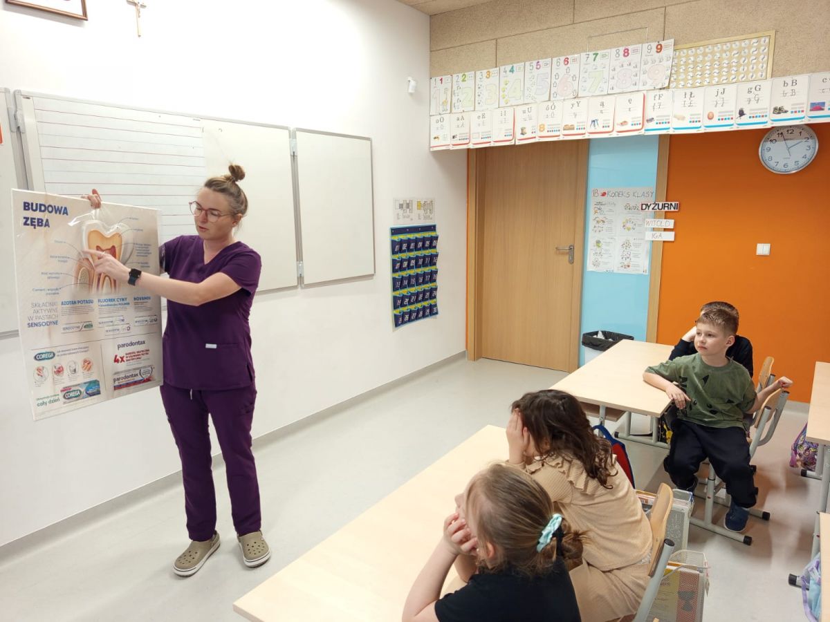 Klasę 1b odwiedziła dzisiaj mama Jasia, pani Justyna Dolata, która jest higienistką stomatologiczną.