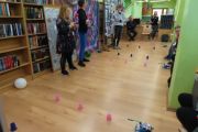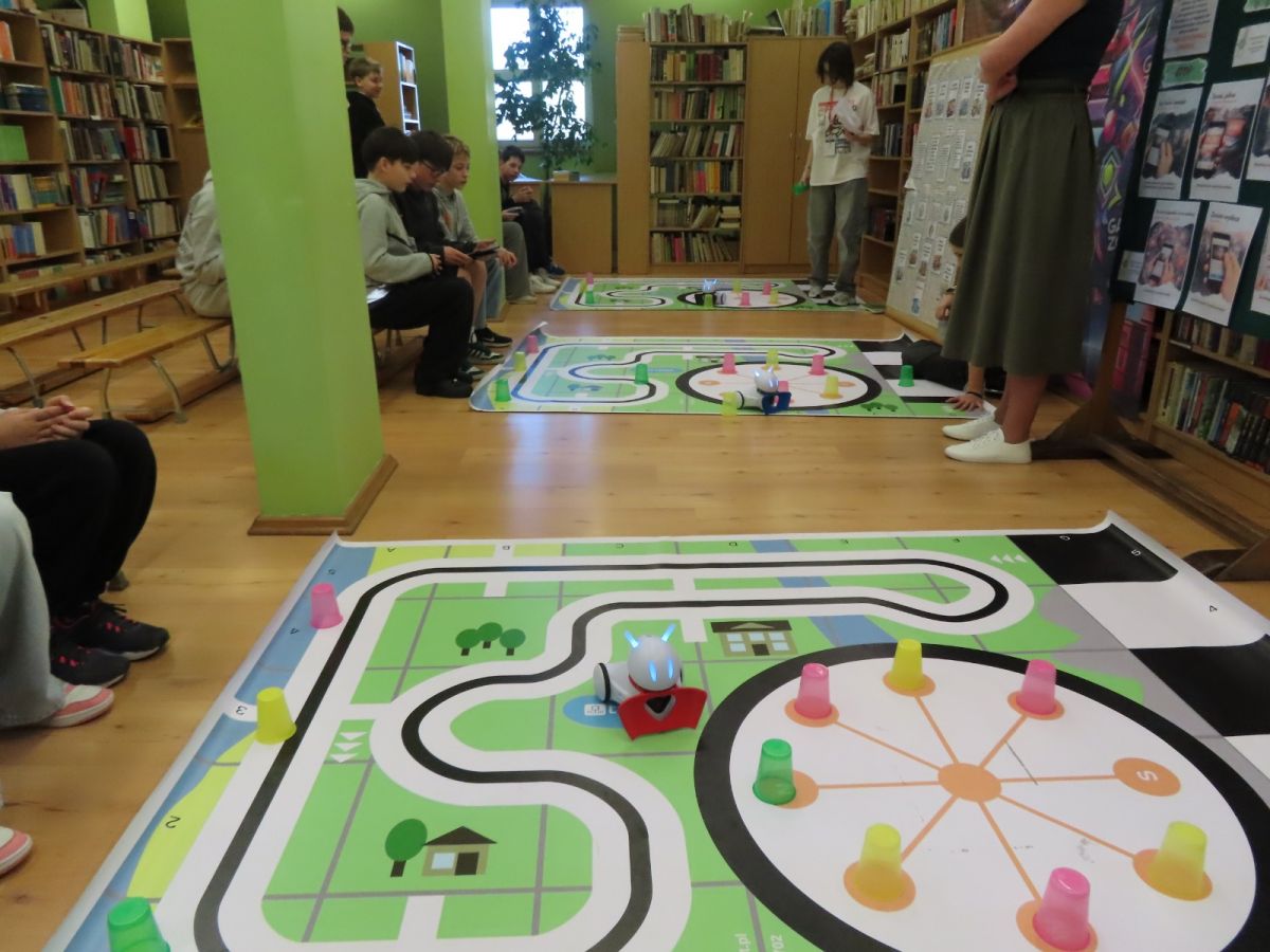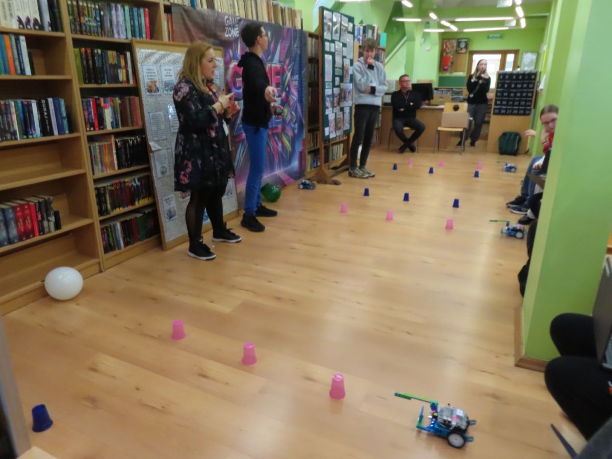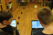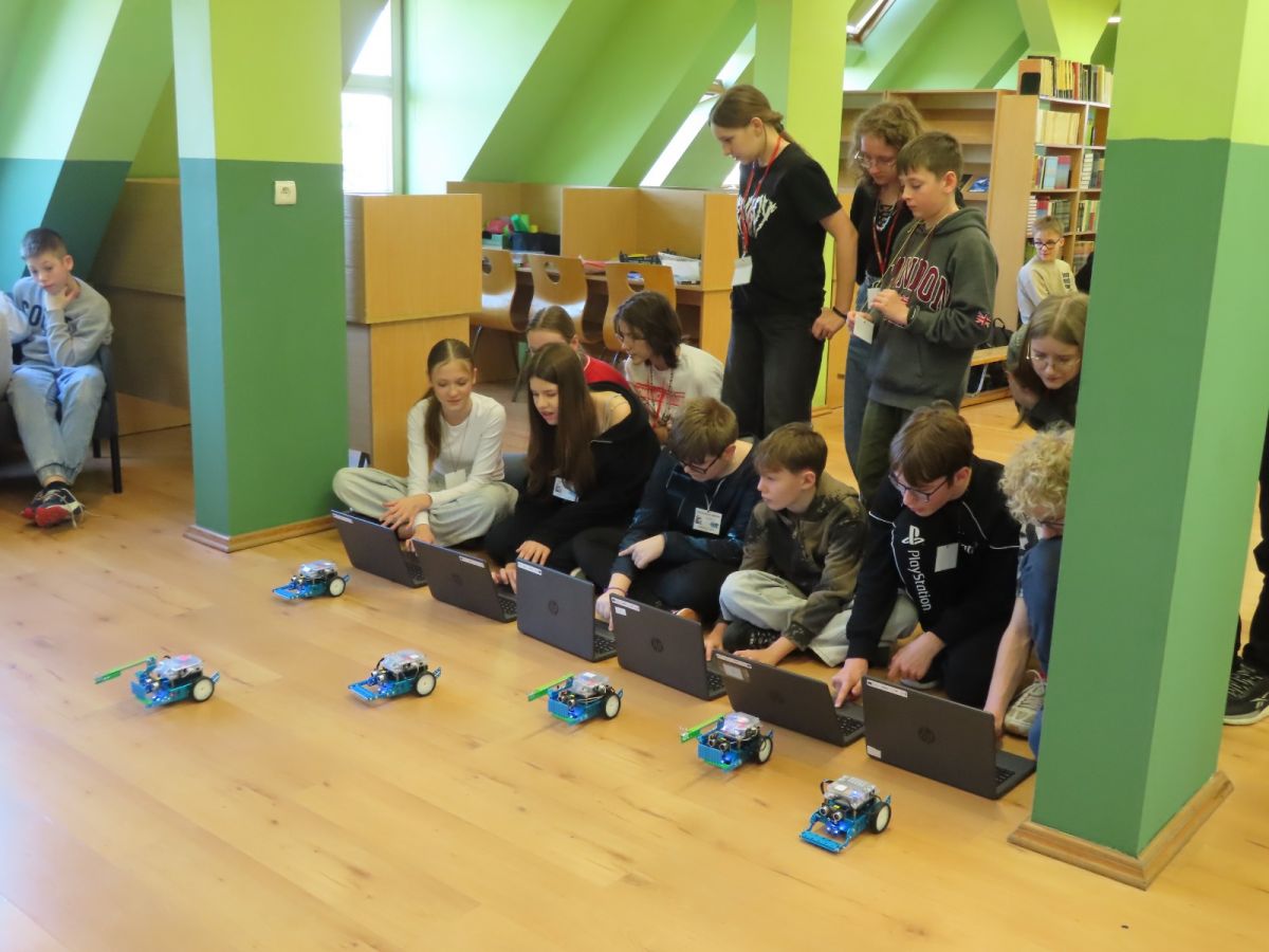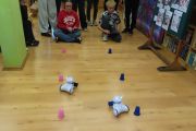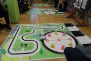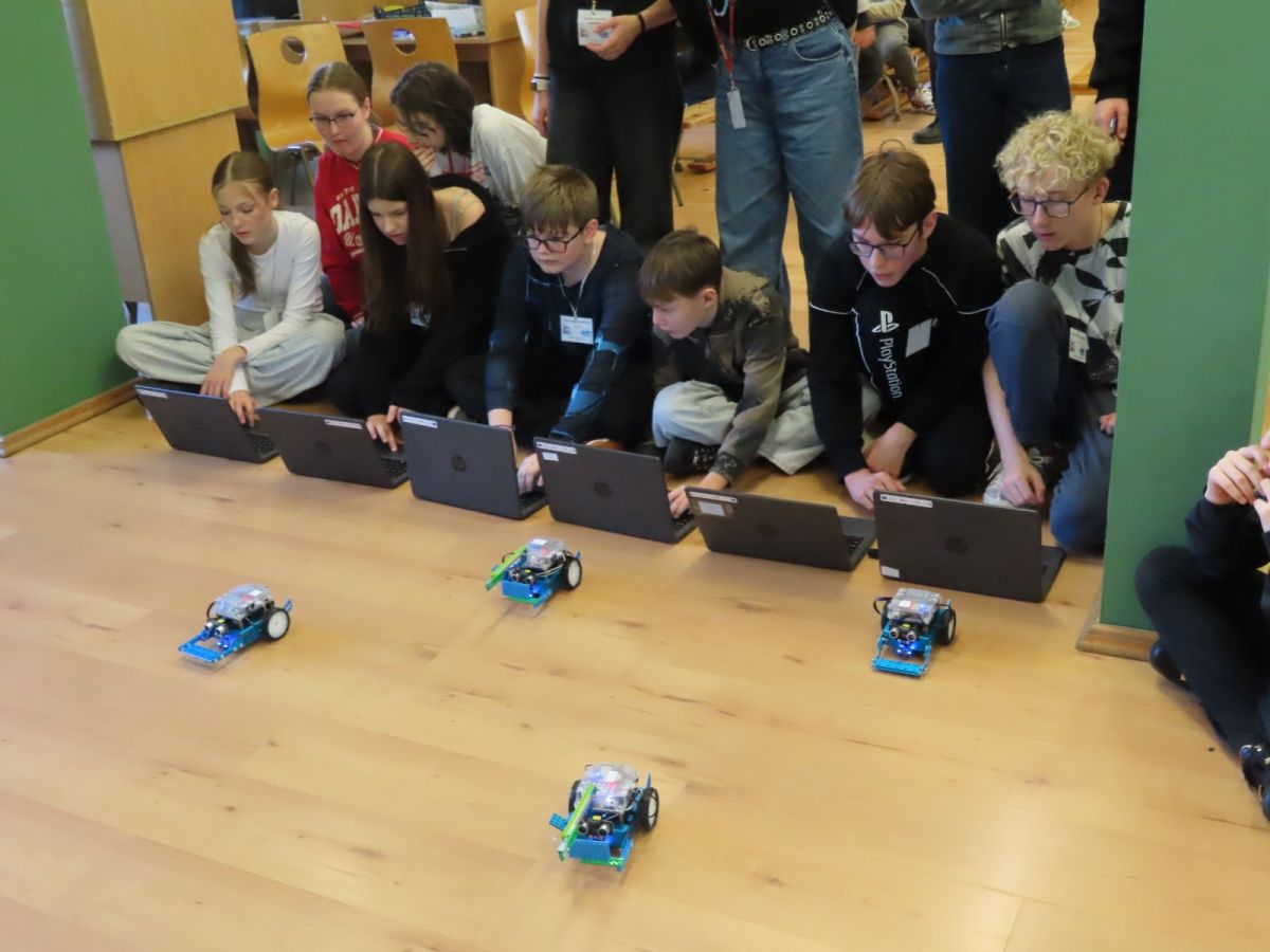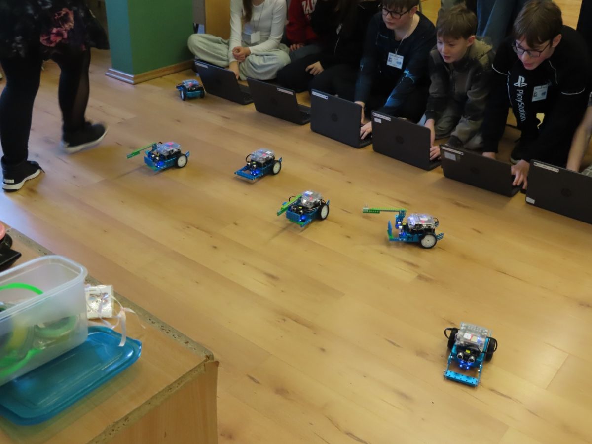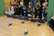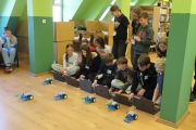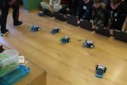 Ogromne emocje wzbudził dwustopniowy wyścig robotów M- Bot zaprogramowanych w programie mBlock. W pierwszym etapie robot musiał przebić balon, a w drugim, pokonać slalom, aby dostarczyć pudełko z zagadką do wyznaczonego miejsca.