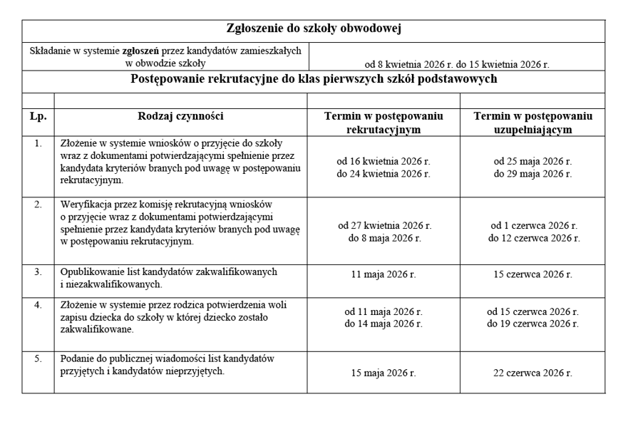 Dzieci zamieszkałe w obwodzie danej szkoły podstawowej będą przyjmowane do klas pierwszych na podstawie zgłoszeń rodziców złożonych