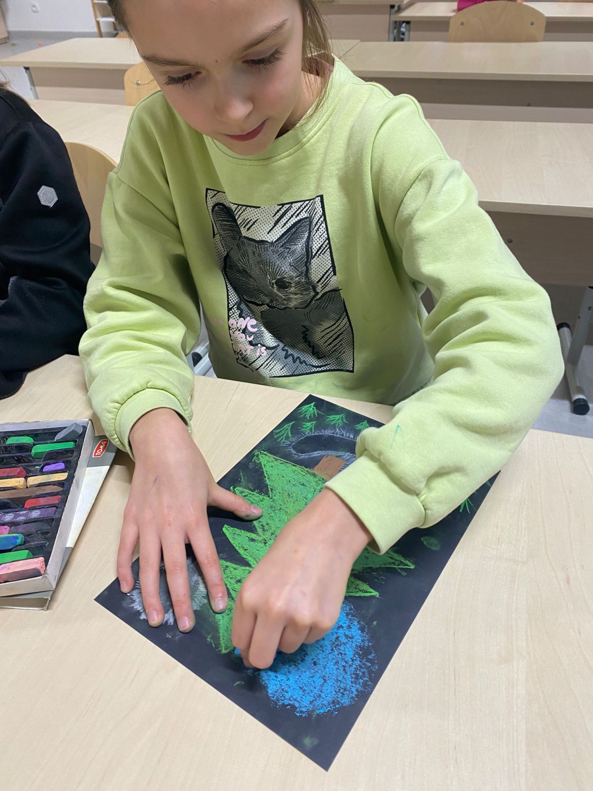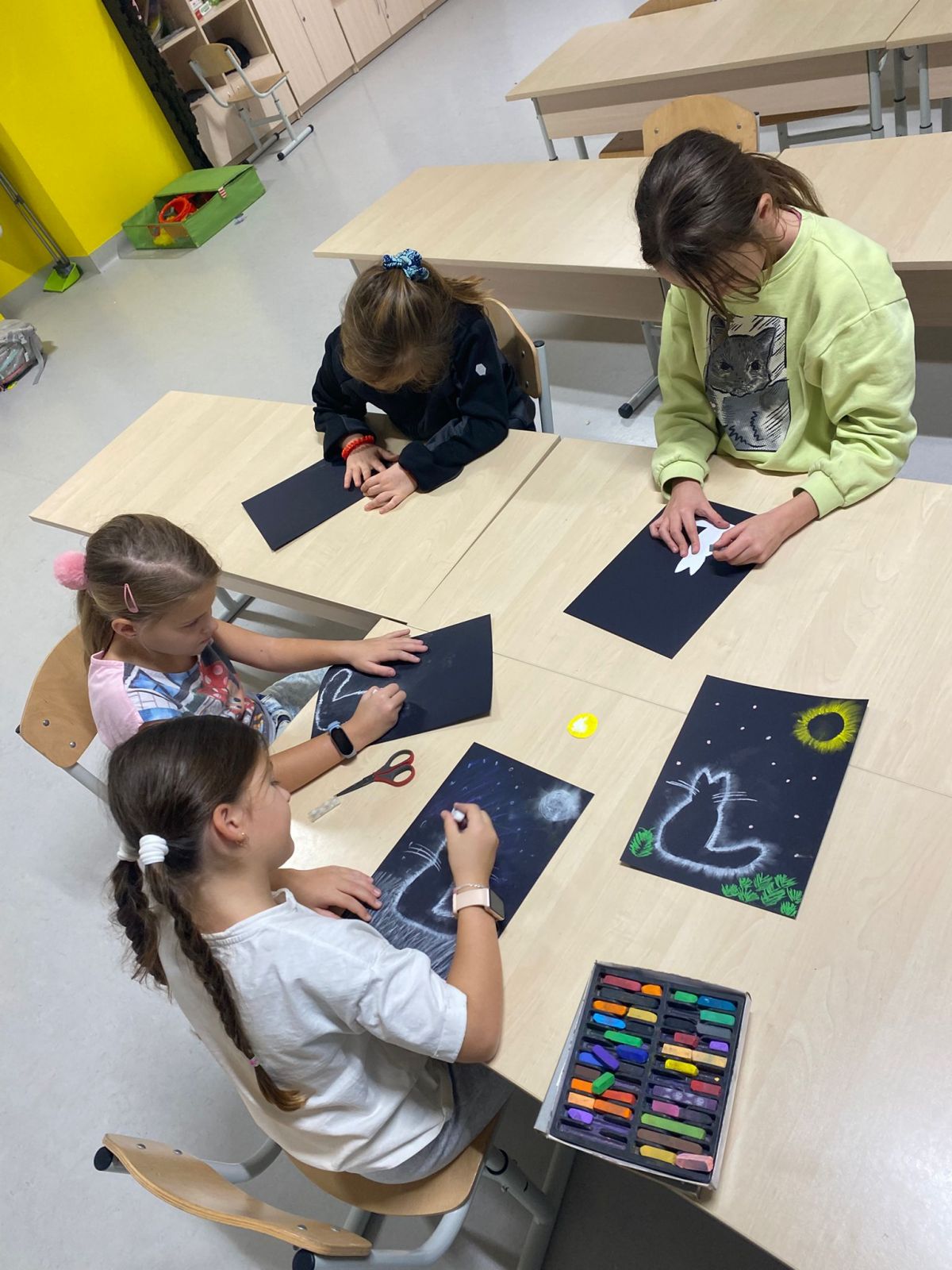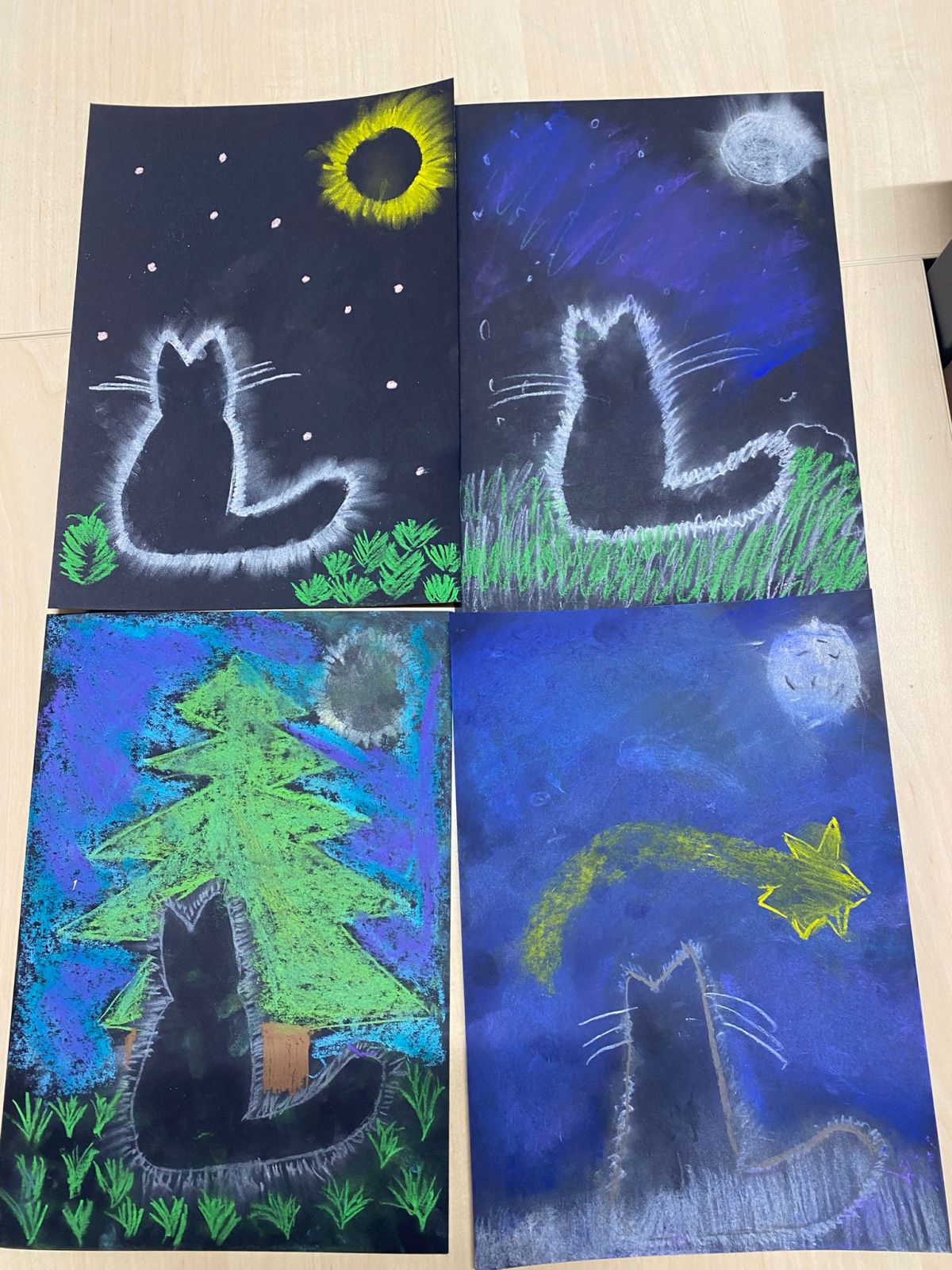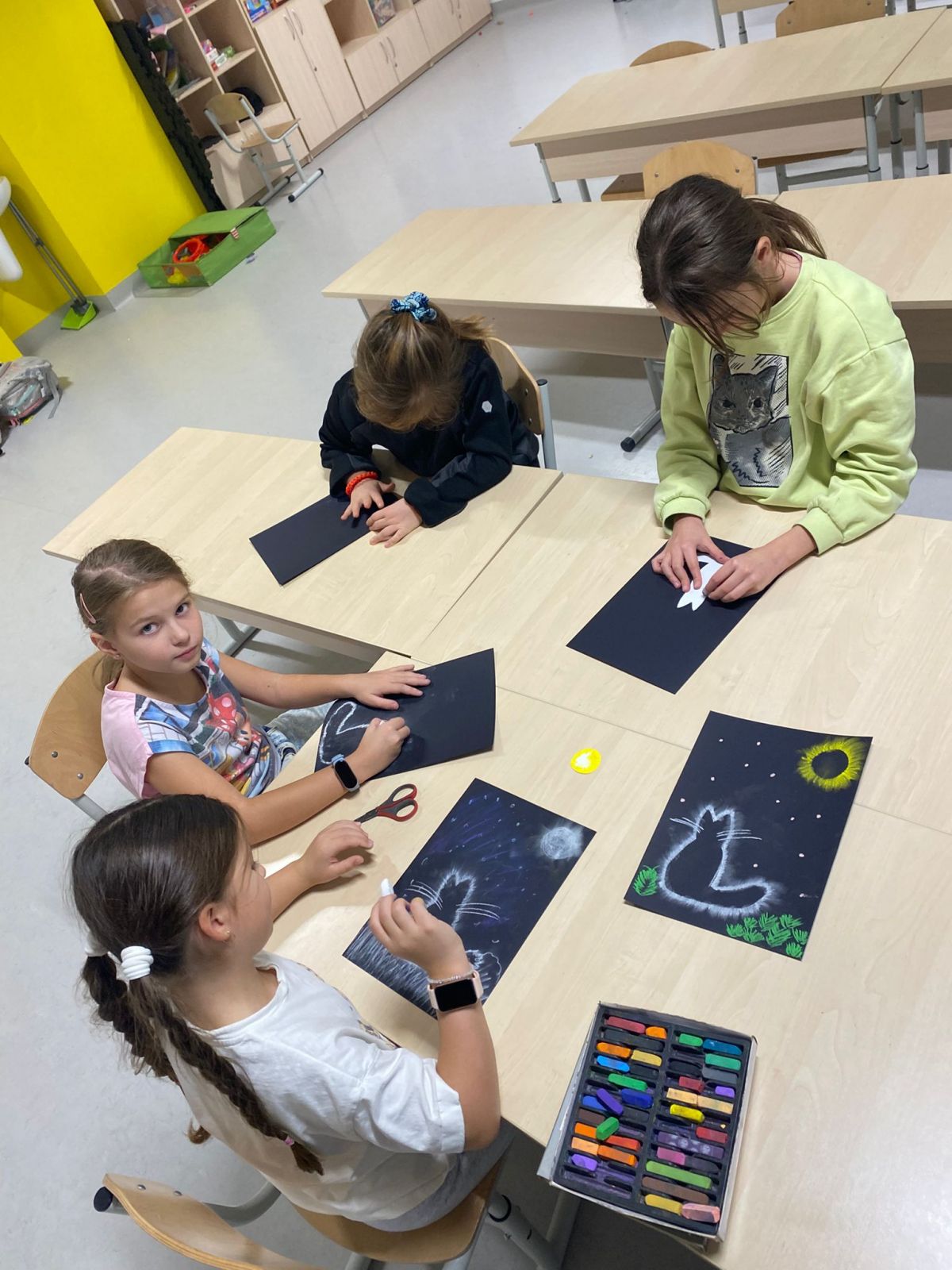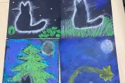 Z okazji Dnia Czarnego Kota dzieci ze świetlicy stworzyły wyjątkowe prace plastyczne. Rysowały sylwetki kotów na czarnym tle, używając kolorowych pasteli, które następnie delikatnie rozcierały, aby uzyskać ciekawy, mglisty efekt. Powstałe prace są pełne barw, klimatu i wyobraźni – wyszły naprawdę piękne!