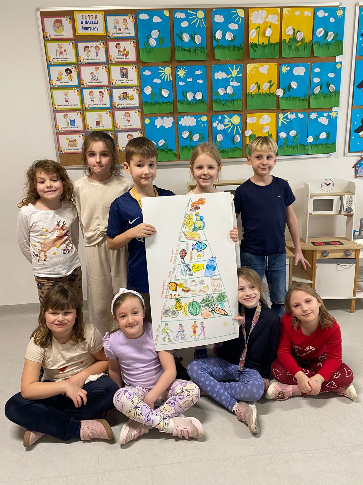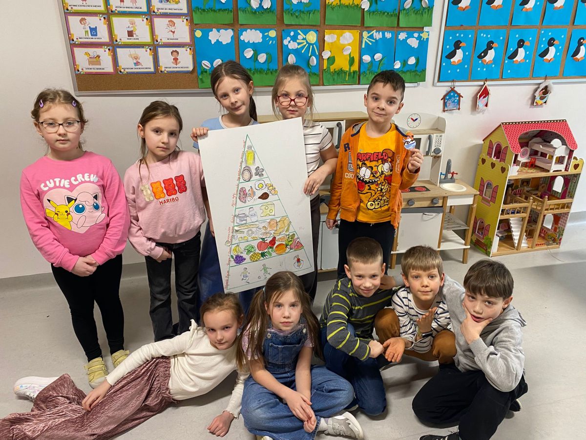 Podczas zajęć w świetlicy uczniowie uczestniczyli w lekcji poświęconej zdrowemu odżywianiu. Rozmawialiśmy o produktach bogatych w witaminy i składniki odżywcze, które są niezbędne do prawidłowego funkcjonowania organizmu. Dzieci wspólnie zastanawiały się, jakie produkty warto spożywać każdego dnia, aby dbać o swoje zdrowie i dobre samopoczucie. Podsumowaniem zajęć było stworzenie piramidy zdrowego żywienia, która pomogła utrwalić zdobytą wiedzę w praktyczny i kreatywny sposób.